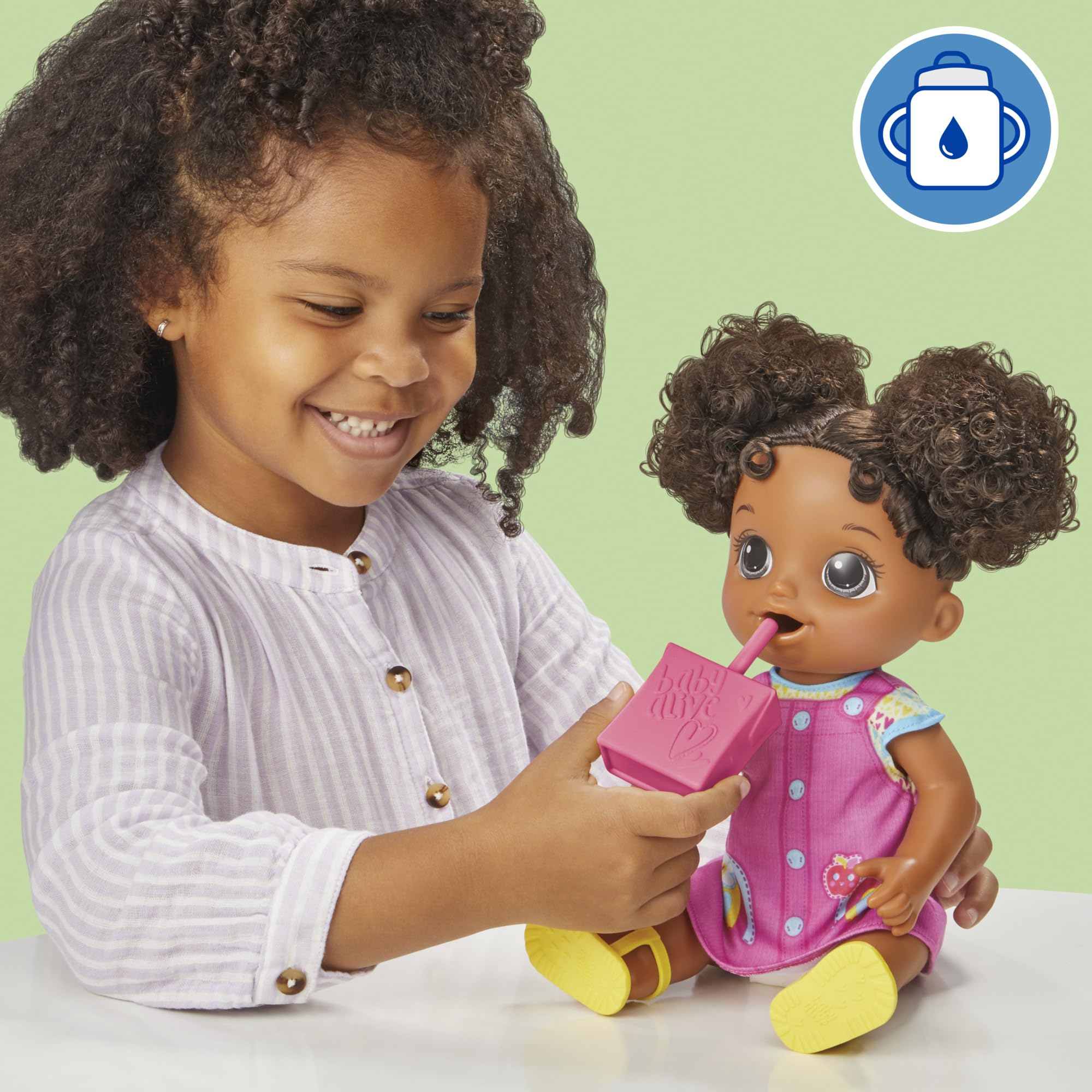 DRINKS AND WETS: She really drinks from her juice box accessory and then wets her Baby Alive diaper