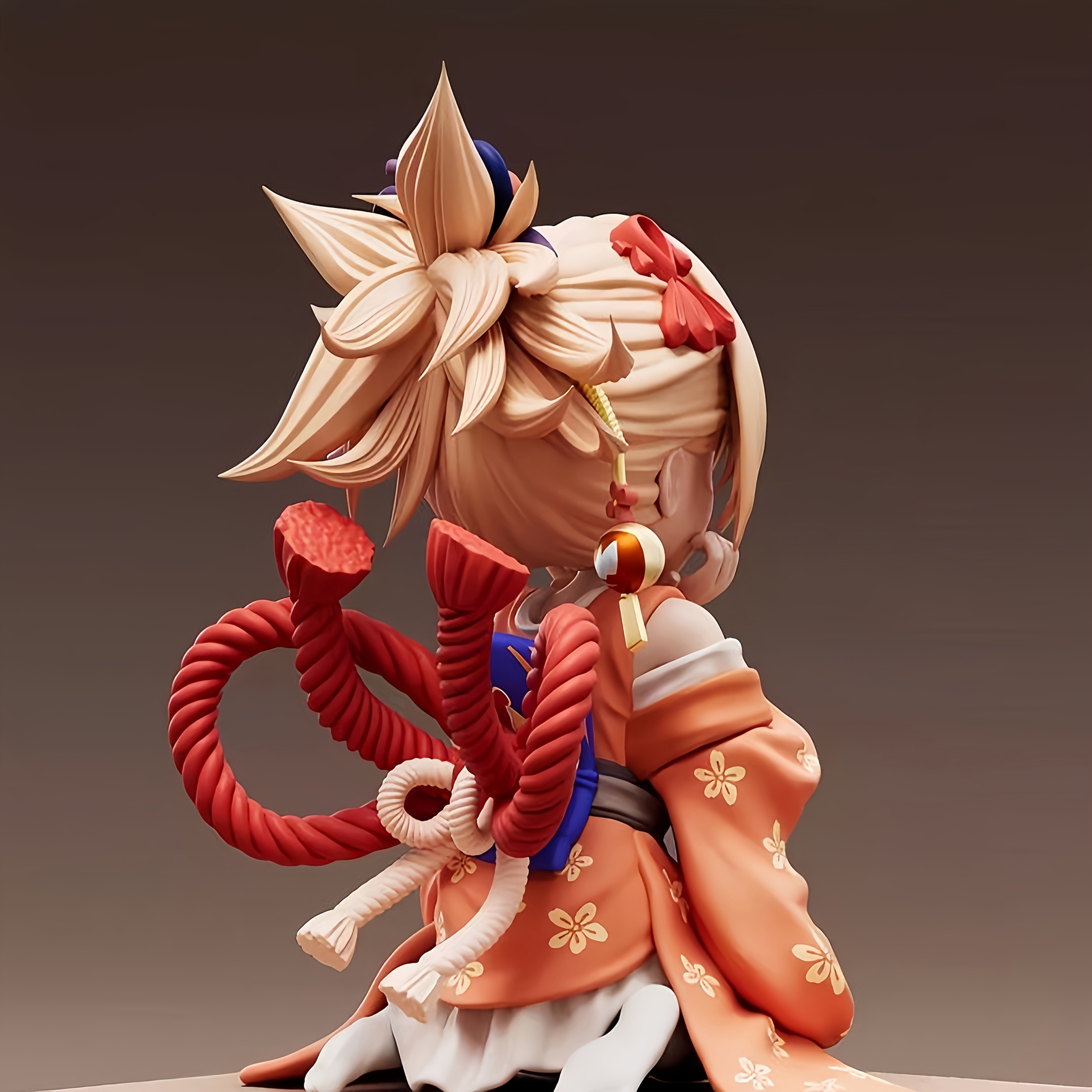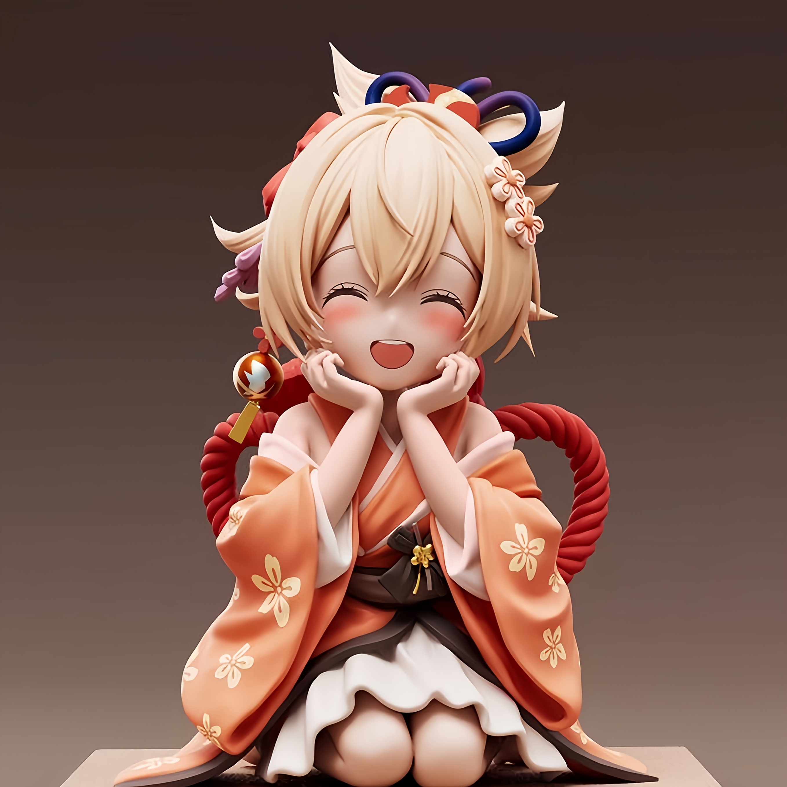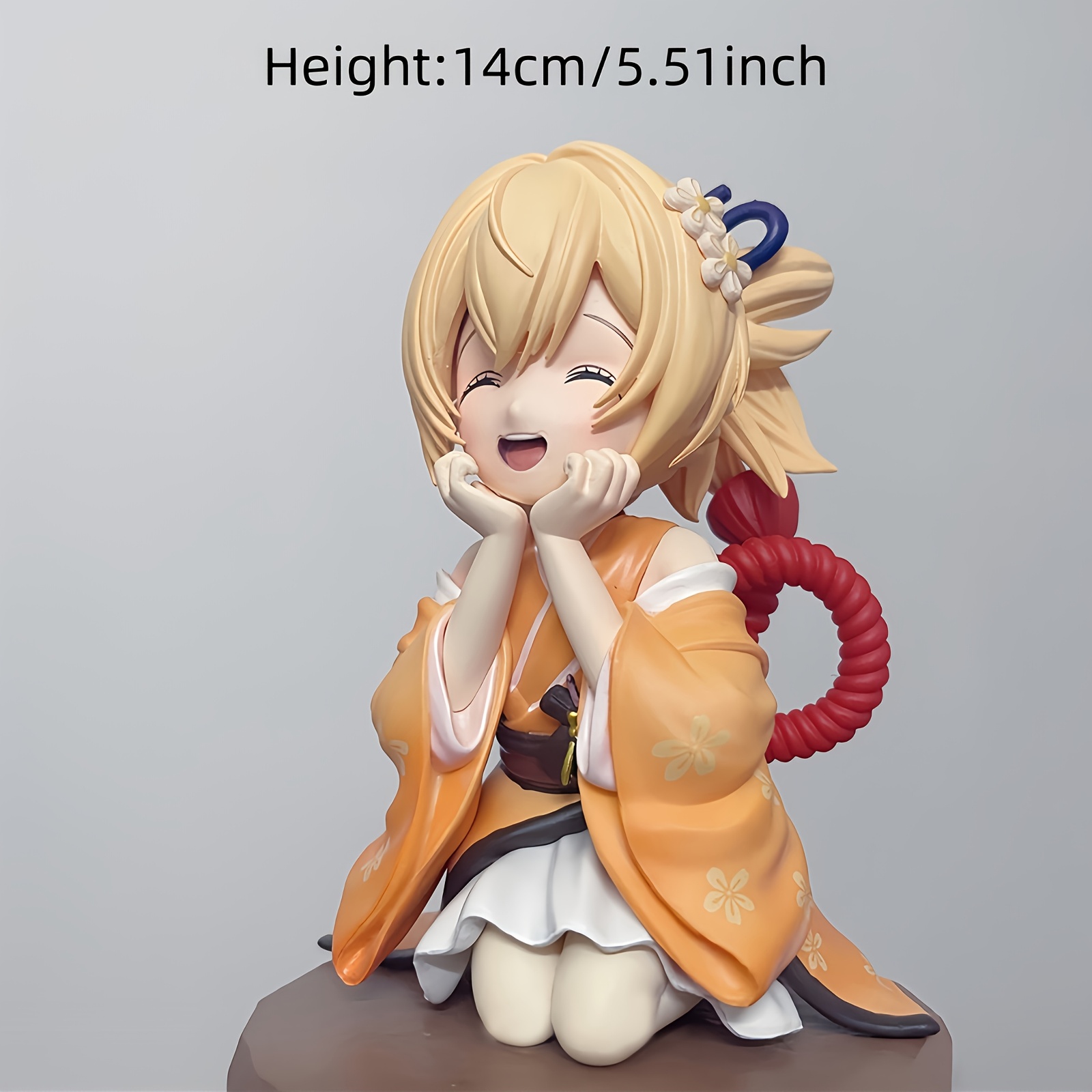 Handmade Anime Figure - Q-Version Smiling Girl in Kimono with Yellow Hair, Kneeling Pose & PVC Resin Collectible Statue Suitable for, Desktop Display, Gift for Gamers and Anime Fans